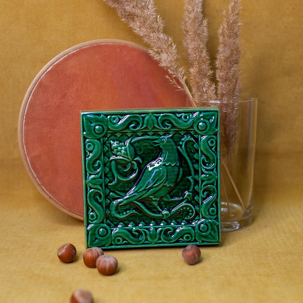 Изделие представляет керамический рельефный элемент квадратной формы, покрытый зеленой глазурью, на котором нанесено стилизованное изображение соловья, вестника майских дней, певца обновления, утра, певца садов. Соловей – это символ любви и радости, трепетной человеческой души. Оберегает брачные узы, приносит мир в дом. При этом выбранный цвет придает дополнительную смысловую нагрузку изделию, поскольку зеленый цвет символ безопасности и изобилия. Данное изделие может быть использовано как изразец, и как самостоятельный настенный декор. При этом смотрится ярко и эффектно, может использоваться в местах, где фантазия архитектора или дизайнера по интерьеру не ограничивается типовым решением, он позволяет сделать акцент, привлекающий взгляд, внести завораживающую изюминку в интерьер. Изразец также будет прекрасным подарком родным, близким, коллегам по работе.