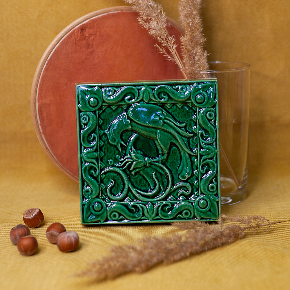 Изделие представляет керамический рельефный элемент квадратной формы, покрытый зеленой глазурью, на котором нанесено стилизованное изображение птицы, которая пьёт нектар из цветка. По фен шуй птицы символизируют новые возможности. Символы птиц, так же как и символы-цветы обладают внутренней универсальной энергией, приносят в дом удачу, процветание, благополучие и достаток. Выбранный цвет изразца усиливает символику изделия, поскольку зеленый цвет также символизирует изобилие, и ещё безопасность. Данное изделие может быть использовано как изразец, и как самостоятельный настенный декор. При этом смотрится стильно и эффектно, может использоваться в местах, где фантазия архитектора или дизайнера по интерьеру не ограничивается типовым решением, он позволяет сделать акцент, привлекающий взгляд, внести завораживающую изюминку в интерьер. Изразец также будет прекрасным подарком родным, близким, коллегам по работе.