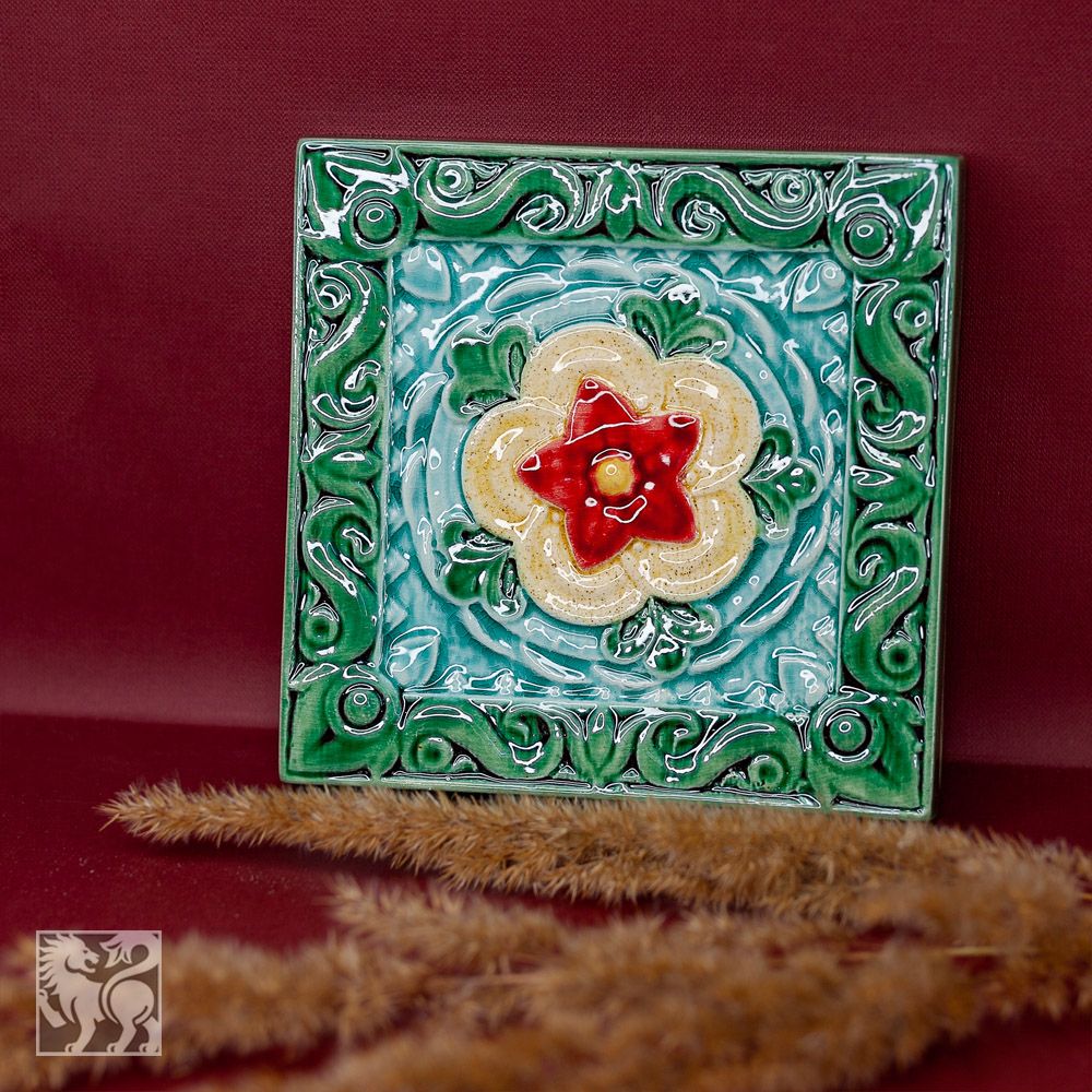 Изделие представляет керамический рельефный элемент квадратной формы, покрытый глазурью. На зеленом фоне яркими цветными красками нанесено стилизованное изображение чертополоха. На Руси отношение к чертополоху всегда было почтительным и мистическим. Это уже видно по названию растения: оно складывается из общеславянских корней “черт” и “полох” (пугать). Магическое значение чертополоха в том, что это сильный оберег, защищающий от опасностей, плохих знакомств, дурного влияния и нечистой силы. Данное изделие может быть использовано как изразец, и как самостоятельный настенный декор. При этом смотрится ярко и эффектно, может использоваться в местах, где фантазия архитектора или дизайнера по интерьеру не ограничивается типовым решением, он позволяет сделать акцент, привлекающий взгляд, внести завораживающую изюминку в интерьер. Изразец также будет прекрасным подарком родным, близким, коллегам по работе.