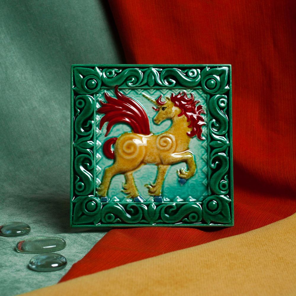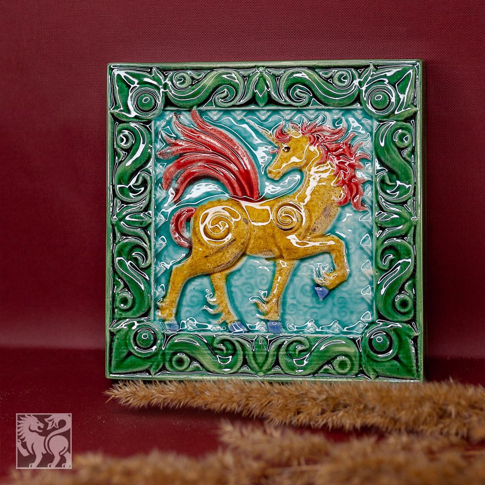 Материалы: белая глина, высокотемпературный обжиг, цветная глазурь. Изделие представляет керамический рельефный элемент квадратной формы, покрытый глазурью На зеленом фоне яркими цветными красками нанесено стилизованное изображение Единорога, создания света, несущего добро, призванное противостоять темным силам, бороться с монстрами и чудовищами. Единорог — это мост между Небом и Землей, между миром светлых принципов и миром темной и плотной материи, проявленного и непроявленного. Единорог является символом пробужденного сознания, целостности и внутреннего покоя, он просвещает, светит в темноте и, подобно утренней звезде, указывает путь, вдохновляя людей в поисках мудрости. Его рог символизирует возможность проникновения Духа в Материю. Данное изделие может быть использовано как изразец, и как самостоятельный настенный декор. При этом смотрится стильно и эффектно, может использоваться в местах, где фантазия архитектора или дизайнера по интерьеру не ограничивается типовым решением, он позволяет сделать акцент, привлекающий взгляд, внести завораживающую изюминку в интерьер. Изразец также будет прекрасным подарком родным, близким, коллегам по работе.