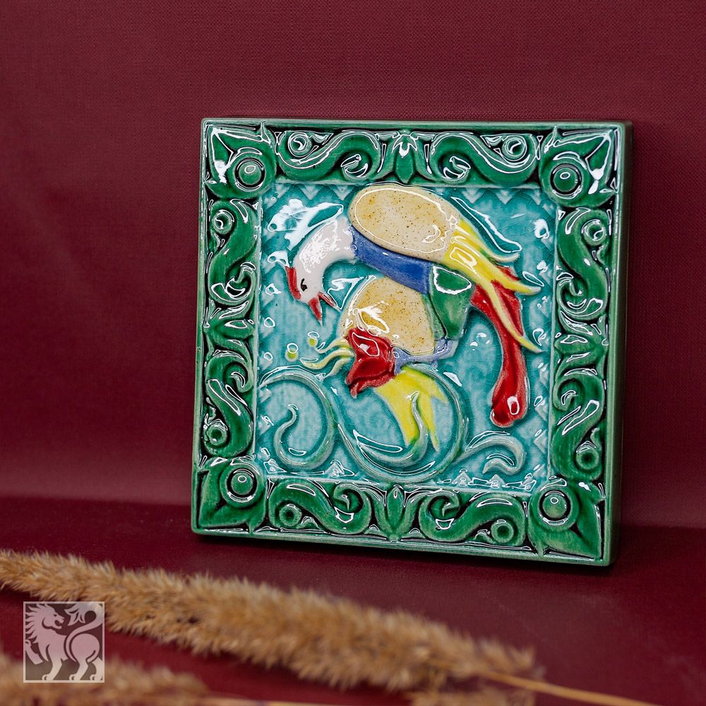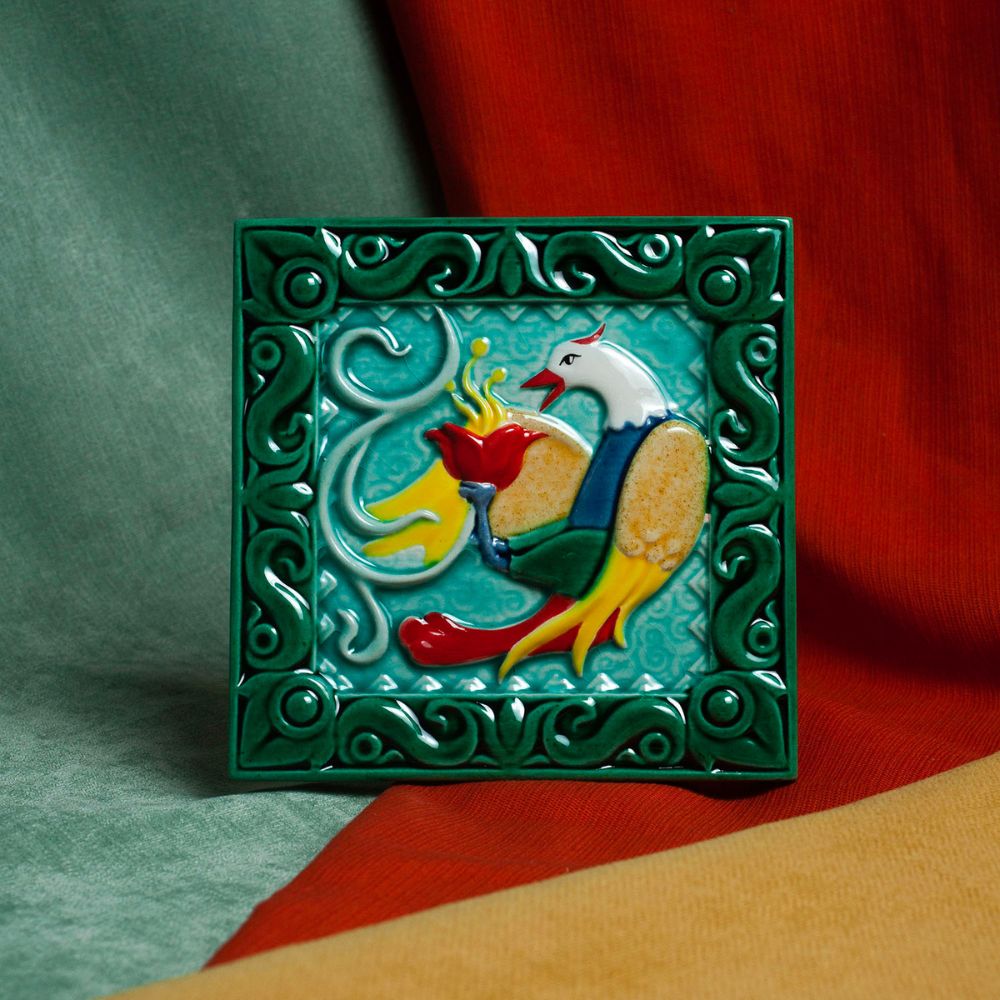 Изделие представляет керамический рельефный элемент квадратной формы, покрытый глазурью. На зеленом фоне яркими цветными красками нанесено стилизованное изображение птицы, которая пьёт нектар из цветка. По фен шуй птицы символизируют новые возможности. Символы птиц, так же как и символы-цветы обладают внутренней универсальной энергией, приносят в дом удачу, процветание, благополучие и достаток. Данное изделие может быть использовано как изразец, и как самостоятельный настенный декор. При этом смотрится стильно и эффектно, может использоваться в местах, где фантазия архитектора или дизайнера по интерьеру не ограничивается типовым решением, он позволяет сделать акцент, привлекающий взгляд, внести завораживающую изюминку в интерьер. Изразец также будет прекрасным подарком родным, близким, коллегам по работе.