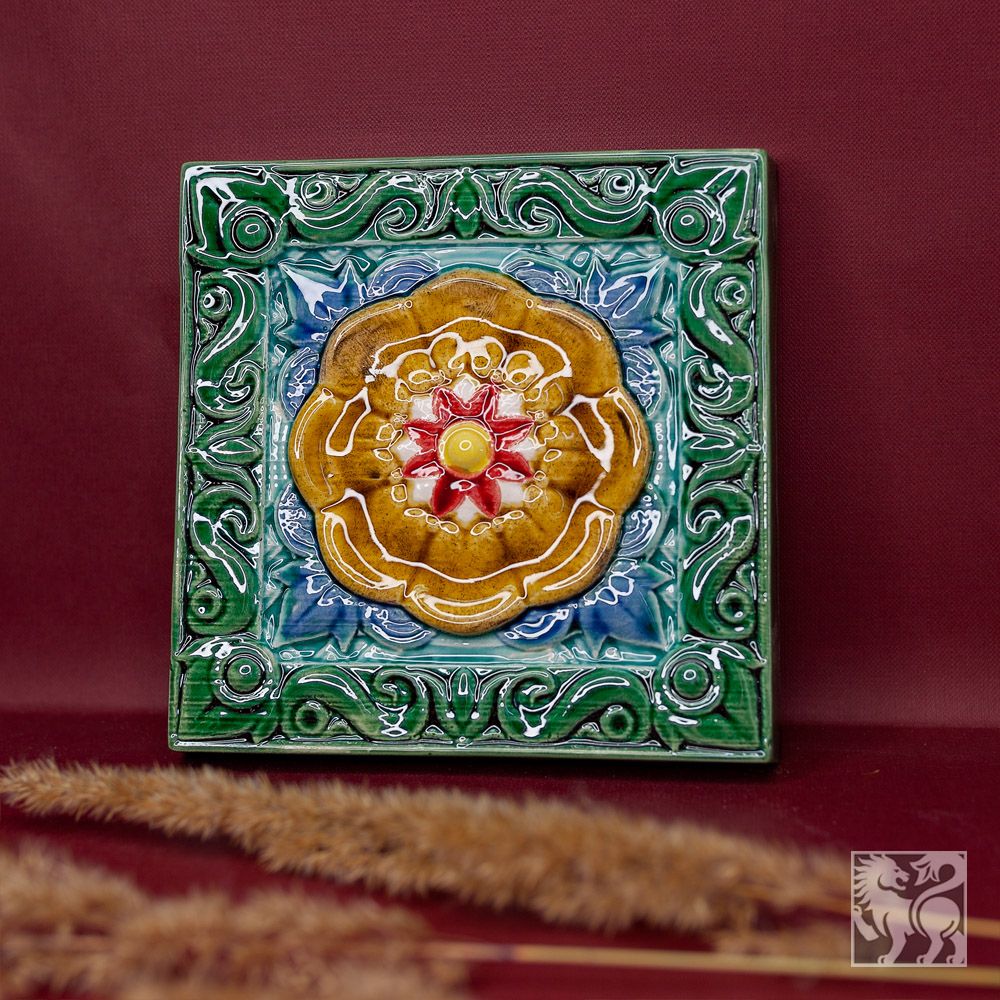 Изделие представляет керамический рельефный элемент квадратной формы, покрытый глазурью, на котором нанесено стилизованное изображение солнца. На зеленом фоне яркими цветными красками нанесено стилизованное изображение солнца. Солнце — это знак мужского начала, созидательной энергии, знаний и интеллекта, величия и храбрости. Выбранный цвет усиливает символику изделия, поскольку синий цвет символизирует воду – живительную влагу, без которой нет жизни на Земле. Данное изделие может быть использовано как изразец, и как самостоятельный настенный декор. При этом смотрится ярко и эффектно, может использоваться в местах, где фантазия архитектора или дизайнера по интерьеру не ограничивается типовым решением, он позволяет сделать акцент, привлекающий взгляд, внести завораживающую изюминку в интерьер. Изразец также будет прекрасным подарком родным, близким, коллегам по работе.