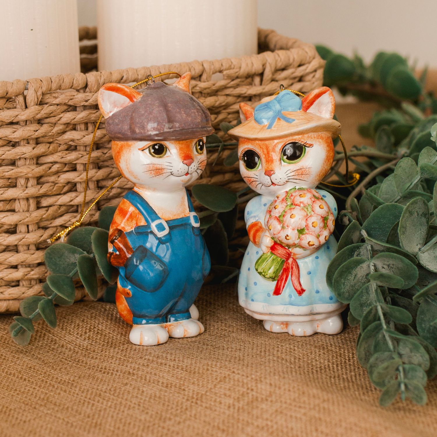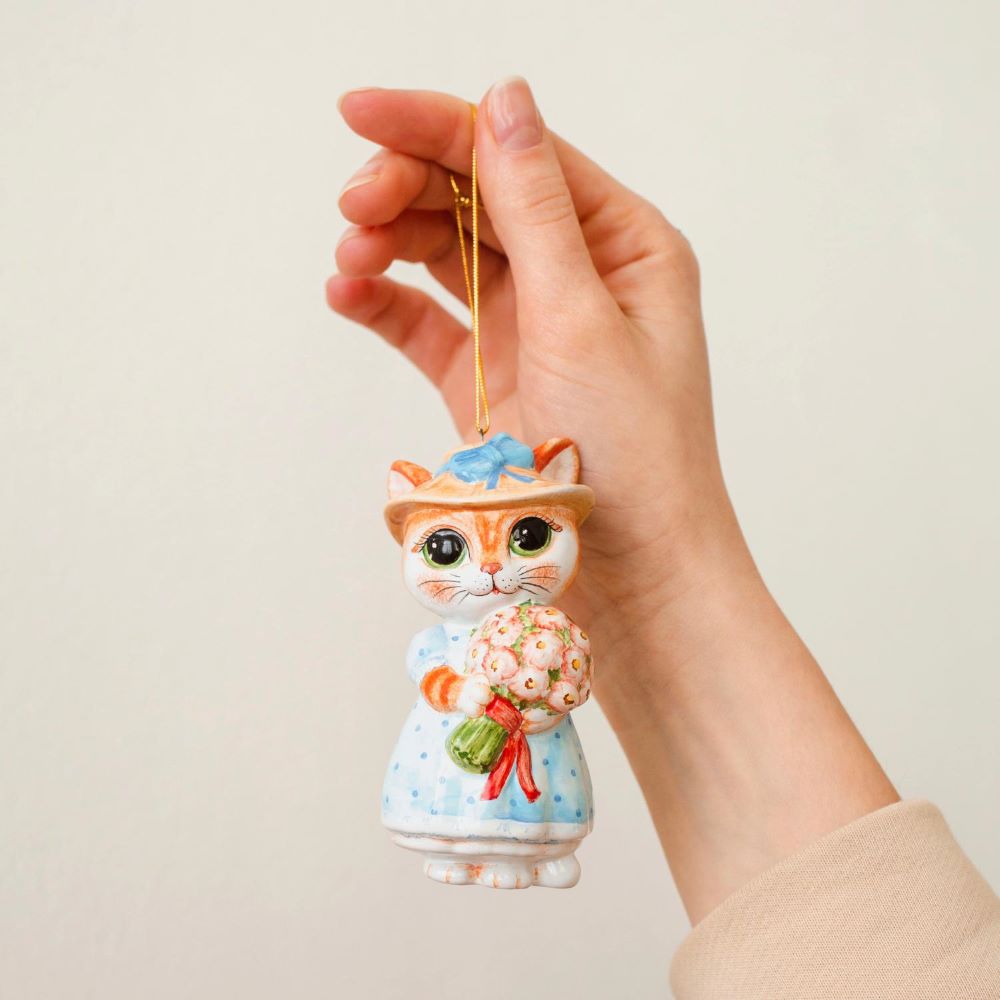 Фигурка “”Кошка с букетом””, выполненная в технике майолика и украшенная ручной художественной росписью, представляет собой милую сцену: кошечка в голубом платье и шляпке прогуливается с подаренным ей букетом цветов. Возможно, этот подарок был от рыжего “”Кота хулигана”” в синих штанишках, который, несмотря на свои проказы, остается неисправимым романтиком. Вместе эти две фигурки создают прекрасную пару, которая в интерьере привнесет весеннее настроение, тепло и уют. Кроме того, изделие может использоваться в качестве украшения новогодней ёлки.”