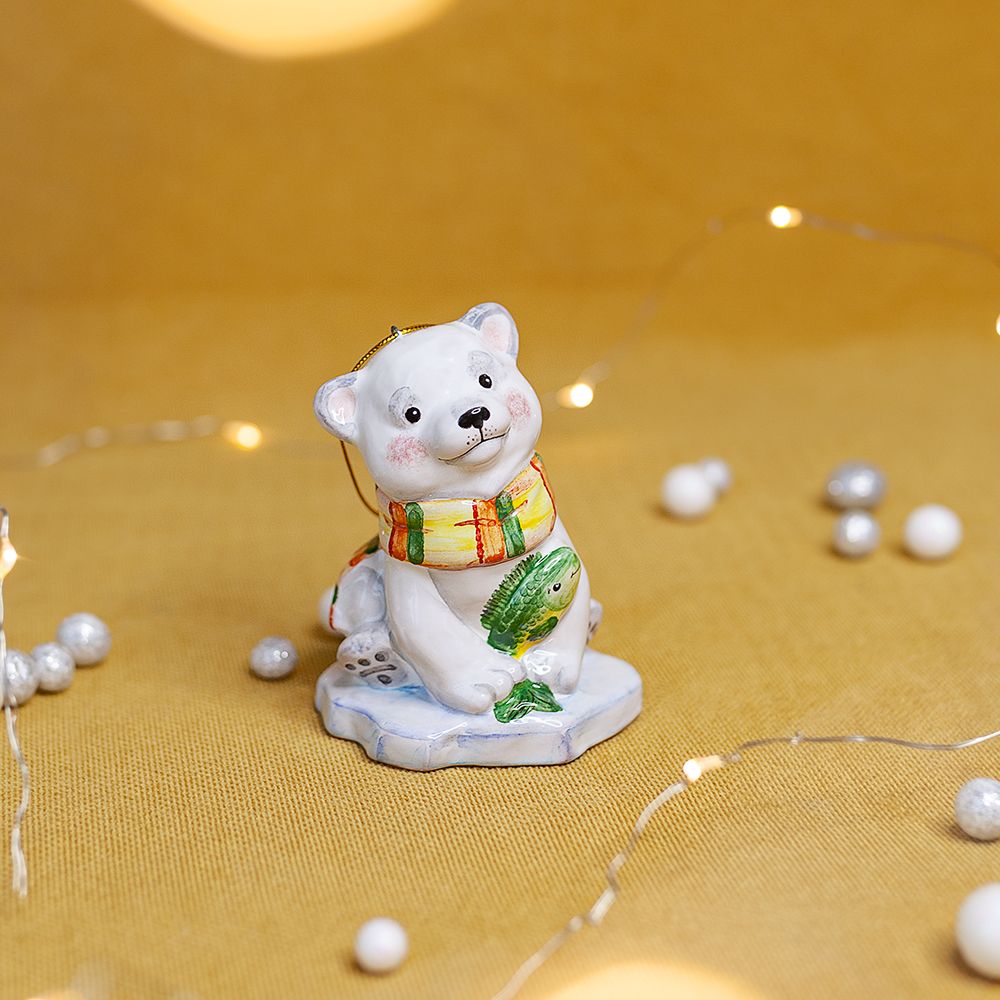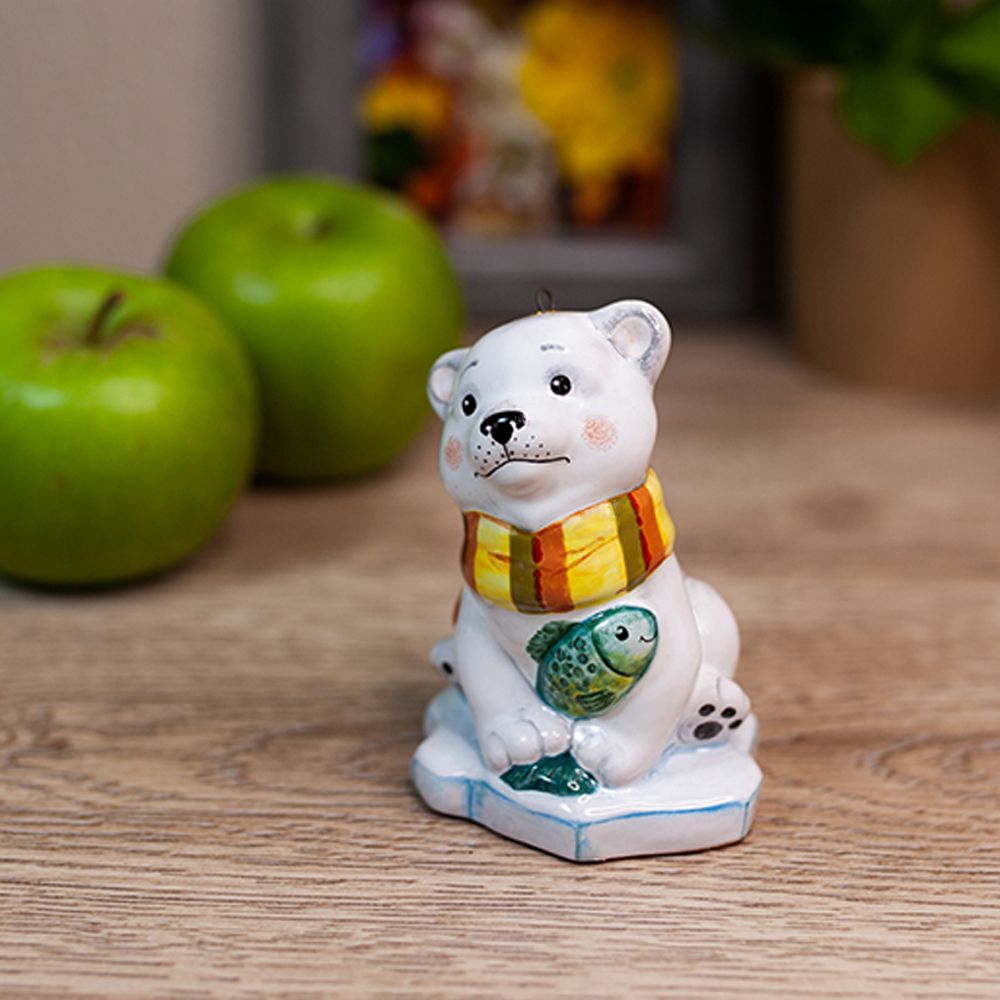 Это изделие ручной работы представляет фигурку обаятельного белого медвежонка на льдине в ярком полосатом шарфе с пойманной рыбиной в лапах. Малыш, изумленно смотрящий на мир, станет интересным акцентом в интерьере и украшением Вашей коллекции керамики, будет чудесным подарком.