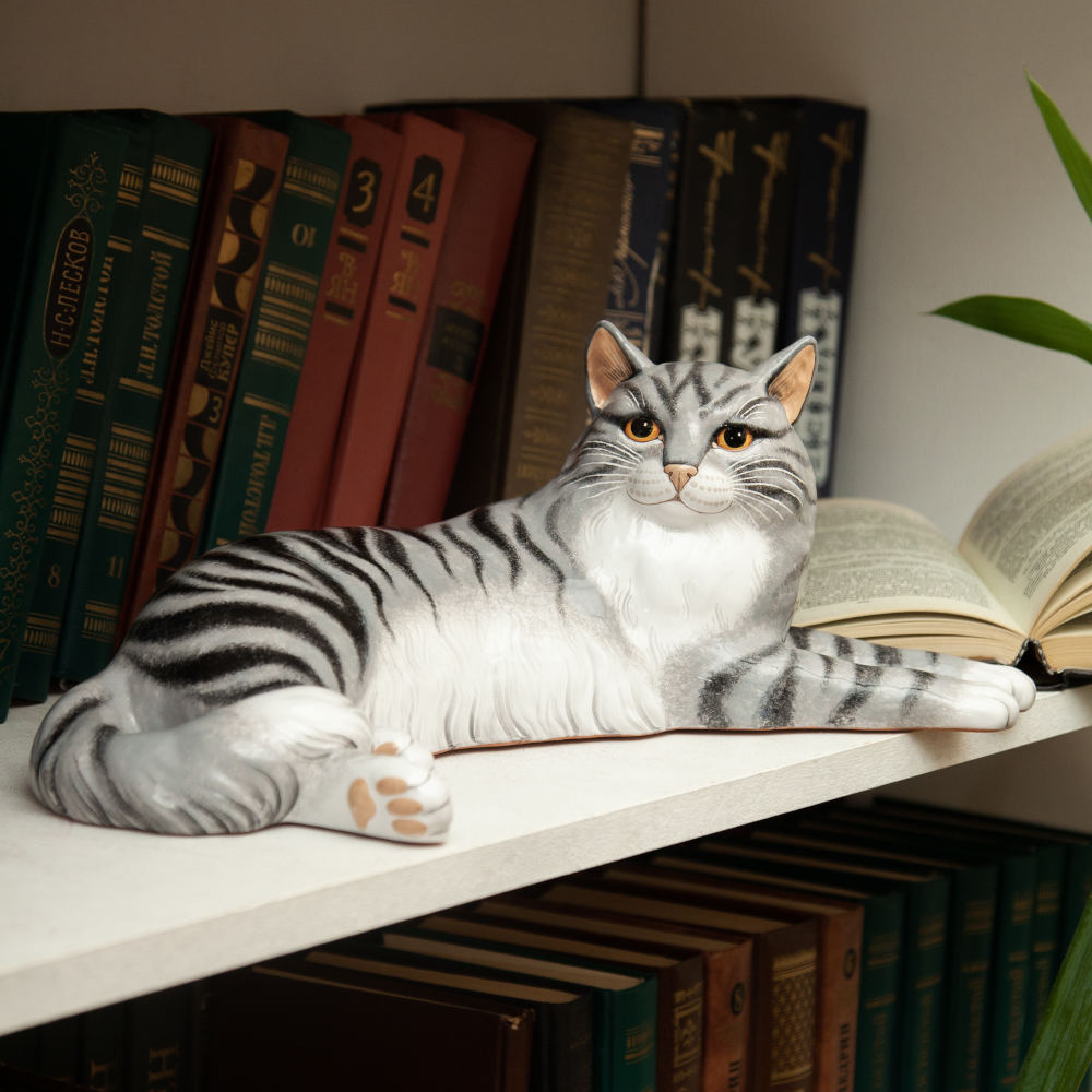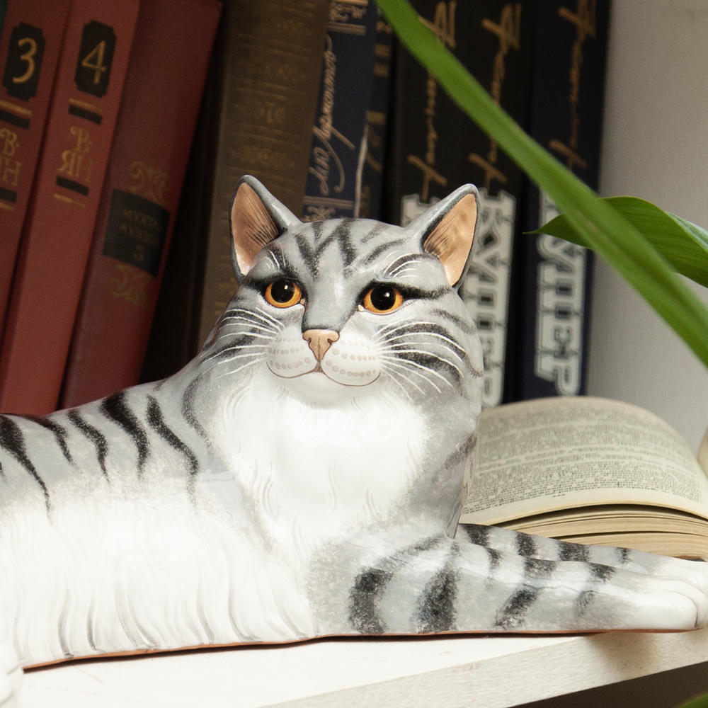 Это изделие ручной работы представляет собой вальяжно расположившуюся грациозную пишистую королеву – Её величество Кошку. Художник воспользовался всей роскошной палитрой современных керамических глазурей, чтобы передать всё обаяние и тайну, которыми обладают эти изящные, ускользающие и вновь являющиеся как ни в чём ни бывало прелестные животные. В пристальном завораживающем кошачьем взгляде чувствуется загадка, волшебство, магия. Вообще, Кошка – удивительное животное, которое живёт рядом с человеком более пяти тысяч лет. У людей и кошек сложились особые отношения – простые, честные, лишённые притворства, без сложностей и противоречий. А для некоторых, особо одиноких людей, кошка является единственным существом, которому можно излить душу, и которое в нашем веке вечной гонки и стресса успокаивает человека так, как это не сделает никакой психоаналитик. Керамическая фигурка кошки оригинально украсить интерьер, будет великолепным подарком любителям кошек, и не только им, займет достойное место в собрании коллекционеров. Возможна роспись по индивидуальному заказу.